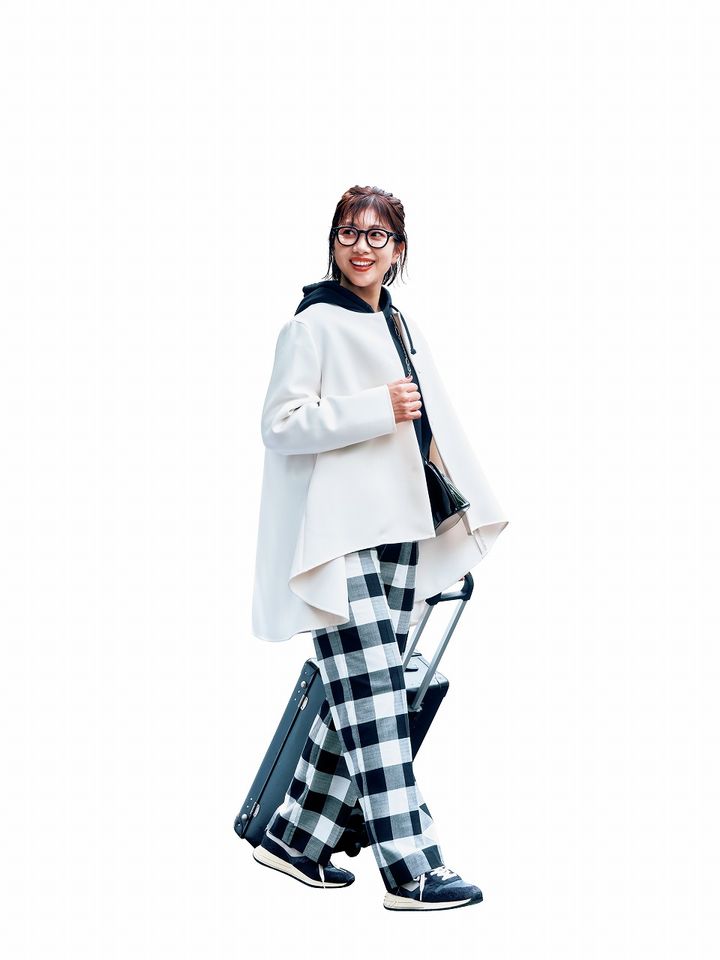 コート¥46,200(ル フィル/ル フィル ニュウマン新宿店)パーカ¥30,800(フィル ザ ビル フォー ユナイテッドアローズ/ユナイテッドアローズ 六本木ヒルズ店)パンツ¥26,200(ツル バイ マリコ オイカワ)バッグ¥45,100(ヴァジック/ヴァジックジャパン)スニーカー¥35,200(オートリー/トヨダトレーディング プレスルーム)メガネ¥42,900(アイヴァン/アイヴァン 東京ギャラリー)ネックレス¥63,800(ブランイリス/ブランイリス トーキョー)キャリーケース/スタイリスト私物