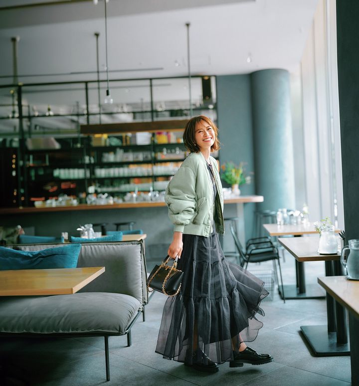 ブルゾン¥49,500スカート¥39,600(ともにウィム ガゼット/ウィム ガゼット 青山店)Tシャツ¥14,300(エイトン/エイトン青山)バッグ¥193,600(ザンケッティ/八木通商)ローファー¥69,300(サクラ/インターリブ)ピアス¥33,000リング¥30,800(ともにメゾンヴァジック/ヴァジックジャパン)パールネックレス¥48,400コインネックレス¥34,100(ともにマリハ)
