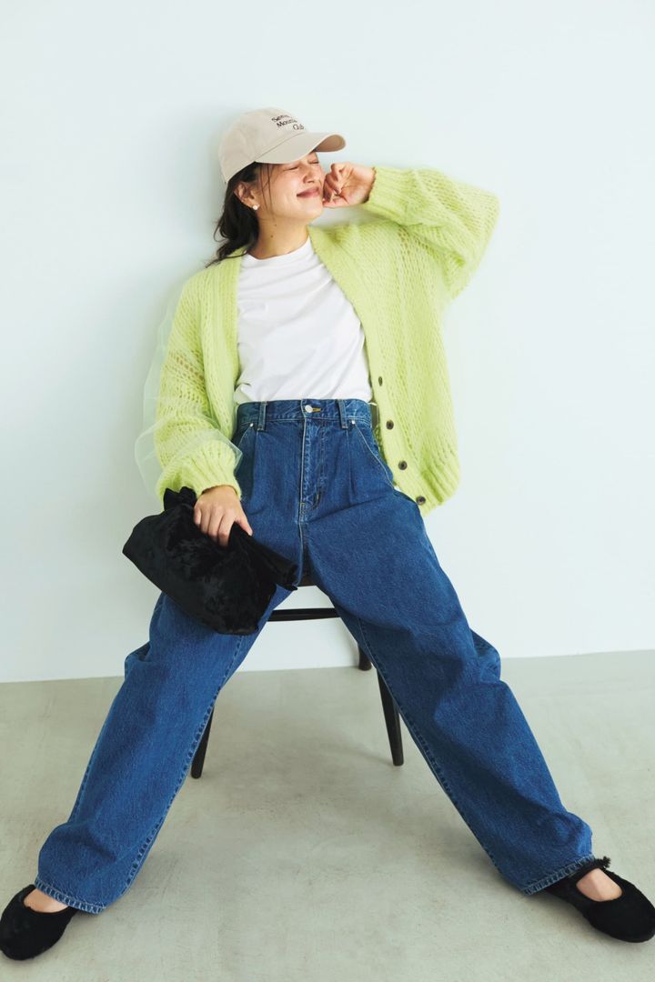 体型を拾わない「タックワイド」ハンサム寄りなタックワイドもジャストウエストならどこかチャーミングな印象に。パステルニットのチュール効果でいつものTシャツ×デニムが瞬時に映える。