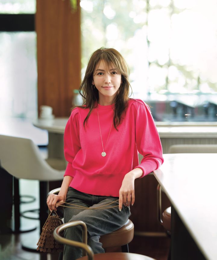 ニット¥31,900(カオス/カオス丸の内)パンツ¥45,100(サクラ/インターリブ)バッグ¥132,000(コラム/エストネーション)メガネ¥42,900(アイヴァン/アイヴァン 東京ギャラリー)イヤリング¥9,900(アビステ)バングル¥39,600(エムシー・スタジオ/ZUTTOHOLIC)リング¥181,500(マリハ)