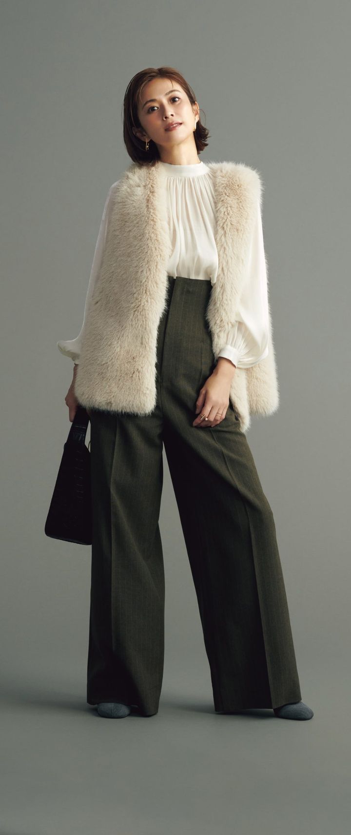 ショートブーツ[H6㎝]¥55,000(ヒューン/クルーズ ショールーム)ジレ¥39,600(アルアバイル)ブラウス¥36,300(ソブ/フィルム)パンツ¥36,300(styling//styling/ ルミネ新宿1店)バッグ¥46,200(オルセット/アッシュプラスエリオトロープ)ピアス¥57,200〈ミチ ウィルウェイ〉リング[左手薬指]¥53,900〈アナプノエ〉(ともにフォーティーン ショールーム)リング[左手人さし指]¥17,600(masae/ロードス)