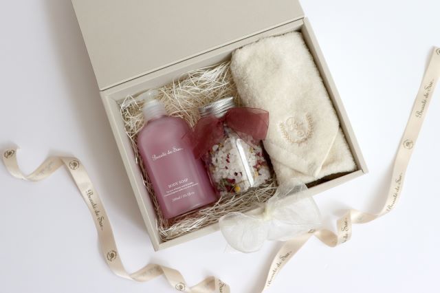 【内容】ボデイソープ(ペアベリー)、ハーブバスソルト(チューリップローズ)、タオル