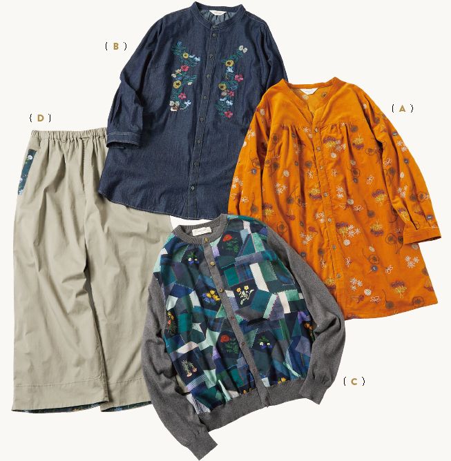 A:細畝コーデュロイ×こっくりとしたオレンジが秋らしく温か。色とりどりの刺しゅうで華やかさもアップ。チュニックブラウス 15、19号 ¥28,600、B:イラストレーター・松尾ミユキさんとのコラボ。松尾さんの描くウサギや鳥、花々を繊細な刺しゅうで表現。デニムチュニックブラウス 15、19号 ¥25,300、C:アメリカンキルトをイメージした柄、鳥や月がモチーフの飾りボタンなど遊び心が満載。コットンウールカーディガン 15、19号 ¥23,100、D:はき心地のよい、ゆったりシルエット×ストレッチ素材。ポケット口と折返し裾のフラワープリントがアクセント。コットンピーチ起毛ストレッチパンツ(11月発売) 15、19号 ¥19,800/すべてsuper hakka feuille(HAKKA)