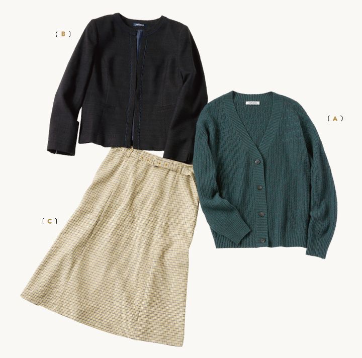 A:ざっくりとした編地が表情豊か。深めのVネックでレイヤードスタイルもスッキリ! ウールコットンVネックカーディガン L13〜L17号 ¥25,300、B:ほんのり光沢のあるスラブウールを使用したツイード生地。洗練されたデザインで通勤からオケージョンまで幅広く対応。ツイードノーカラージャケット L13〜L25号 ¥46,200〜¥48,400、C:繊細なガンクラブチェックが上品。明るめの色みで、トラッドな装いに彩りを添え、鮮度もアップ! ベルト付きフレアスカート L13〜L23号 ¥26,400〜¥29,700/すべてニューヨーカー(ダイドーフォワード)