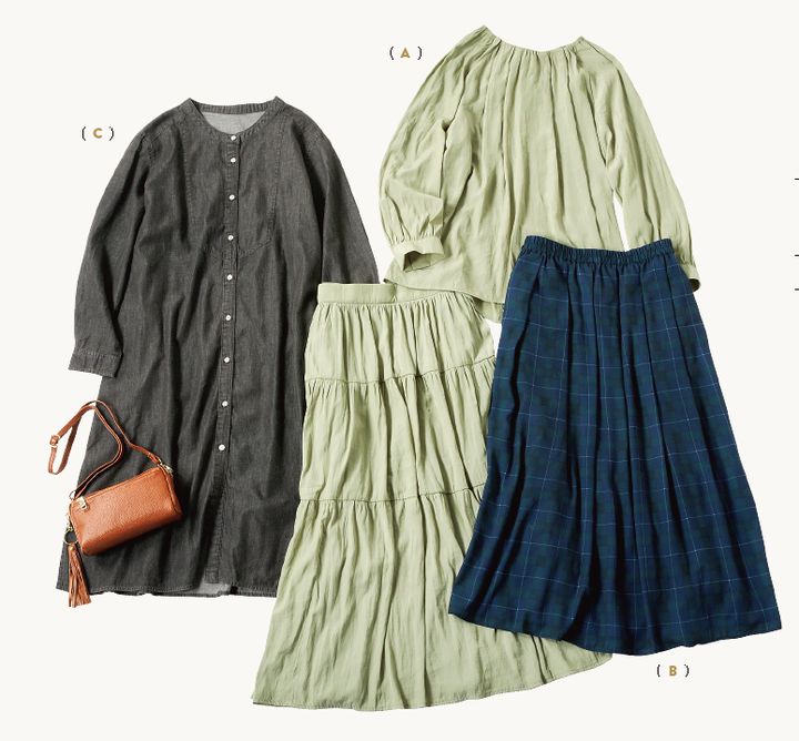 A:ブラウス、スカート共に、落ち感と表情のあるビンテージサテン素材を使用。品のある素材感で、上下セットアップで着こなすのもオススメ。ビンテージサテンバックリボンブラウス LL〜5L ¥5,500、ビンテージサテンティアードスカート LL〜5L ¥6,050、B:落ち感のあるジョーゼット素材×秋冬らしい落ち着いた配色で大人っぽい一枚に。ジョーゼットチェック柄タックスカート L〜5L ¥8,800、C:柔らかで丈夫な薄手のデニムワンピースは、羽織としても活躍。両サイドのスリットで足さばきも軽やか。シュリンクレザーのバッグはコンパクトなサイズ感でカジュアルな装いのアクセントに最適。ライトオンスデニムバンドカラーシャツワンピース LL〜5L ¥7,150、ミニショルダーバッグ ¥6,600/すべてMB mint breeze(ヒロタ)