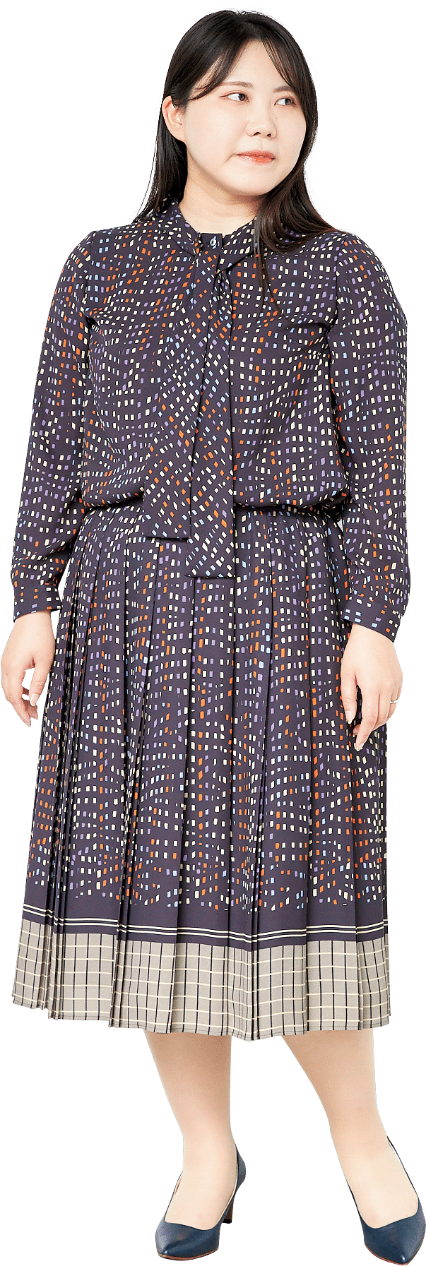 イルミネーションプリントボウタイブラウス L13~L25号 ¥28,600〜¥31,900、イルミネーション&チェックパネルプリントプリーツスカート L13~L25号 ¥37,400〜¥40,700、パンプス 参考商品/すべてニューヨーカー(ダイドーフォワード)
