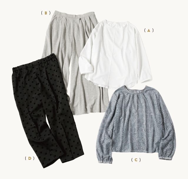 A:さらりとした肌触りの高機能素材を使用。シワが気になりにくく、UV対策も可能。カットソートップス S〜4L ¥4,389、B:ミニ裏毛素材で軽やかなはき心地。キレイめでカジュアルになり過ぎないところもうれしい。スウェットスカンツ S〜4L ¥4,620、C:コットン混の柔らかなレースはタイル柄で甘過ぎず、程よい透け感もポイント。前後2WAY仕様で羽織にも。総レースブラウス S〜4L ¥4,378、D:美シルエット×さり気ないドット柄が上品。フロッキープリントで仕上げることで、無地感覚ではけるところも◎ テーパードパンツ M〜4L ¥6,270/すべてIEDIT(フェリシモ)