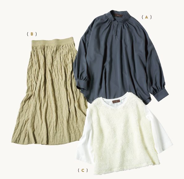 A:身幅も袖幅もゆったりで、体のラインを拾いにくい絶妙シルエット。柔らかなシフォン生地が上品で着回し力も高い一枚。ブラウス フリーサイズ(S-3L対応) ¥7,980、B:シワ加工を施し、こなれ感のある表情に。ストレッチ性のある生地を使用し、動きやすく、ストレスフリーな着心地を実現。ワッシャーニュアンススカート フリーサイズ(S-3L対応) ¥11,190、C:細かいフリルチュールが華やかで洒落感たっぷり。柔らかなカットソー生地で着心地も抜群。フリルチュールカットソートップス フリーサイズ(S-2L対応) ¥8,900/すべてCAWAII(ワンピース)