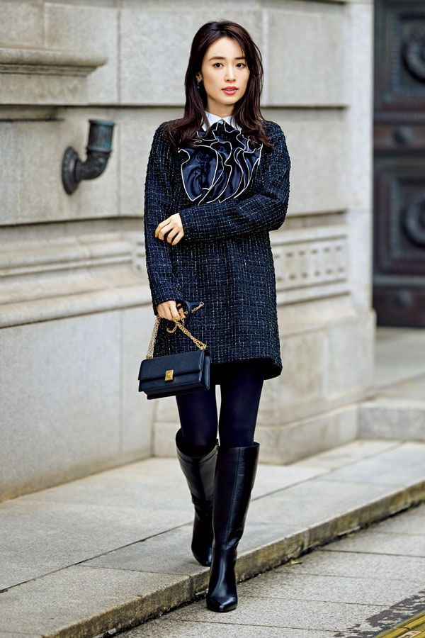 ワンピース¥18,700/MERCURYDUO イヤリング¥14,300/ランバン オン ブルー(ヴァンドームヤマダ) バッグ¥44,000/ケイト・スペード ニューヨーク(ケイト・スペード カスタマーサービス) タイツ¥1,320/靴下屋(Tabio) ロングブーツ¥44,000/銀座かねまつ(銀座かねまつ6丁目本店)