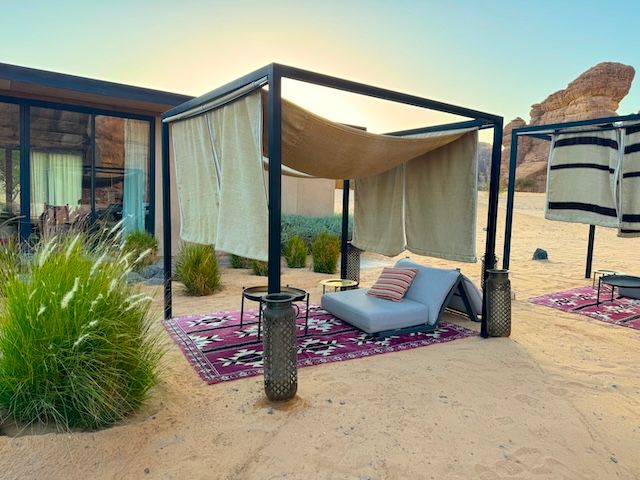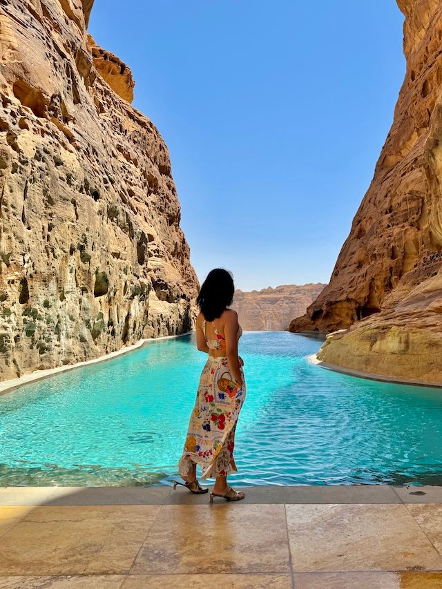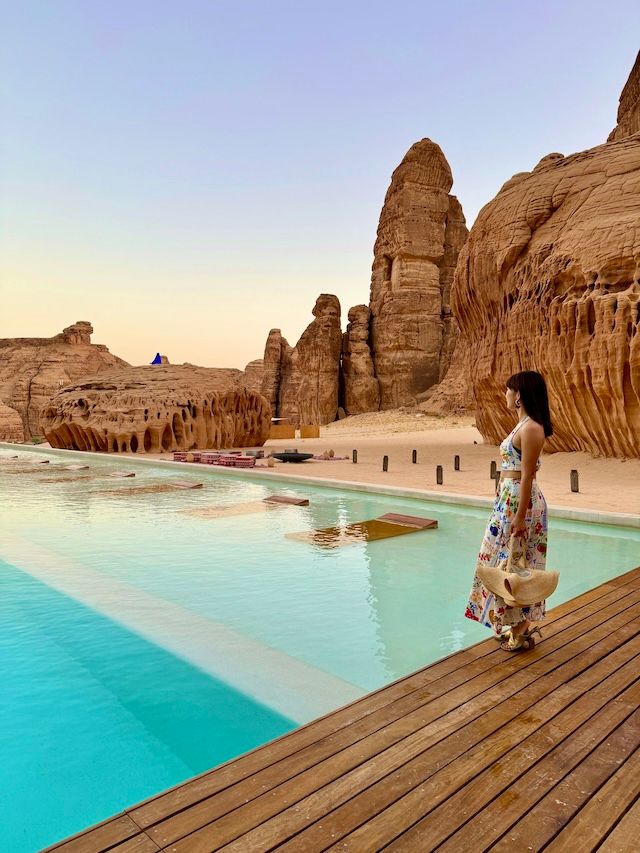 もう1つ比較されるホテルが、英国で急成長を遂げるホテルブランド・アワ・ハビタスの中東第1号のホテルである、アワ・ハビタス・アルウラ (Our Habitas Alula)。敷地内に美術品を展示し、「野外美術館」と呼ばれることも。人気なのは、こちらもインフィニティープール。砂漠の真ん中に置かれた広大なプールで、敢えて浅く作っている箇所があるので、ここを歩くだけで砂漠の中にある水の中を浮いているように歩く写真が撮れると世界中で話題なのです。