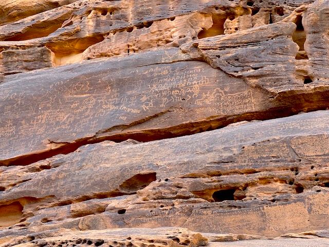 他にも必見なのは、ジャバル・イクマ。古代のアラビア語が岩に刻まれており、「野外図書館」と呼ばれています。いまだに岩に刻まれた文字の凹凸が綺麗に残っていることに感動! なんと書いてあるのかは完全には理解できませんでしたが、その保存状態がすごすぎました。