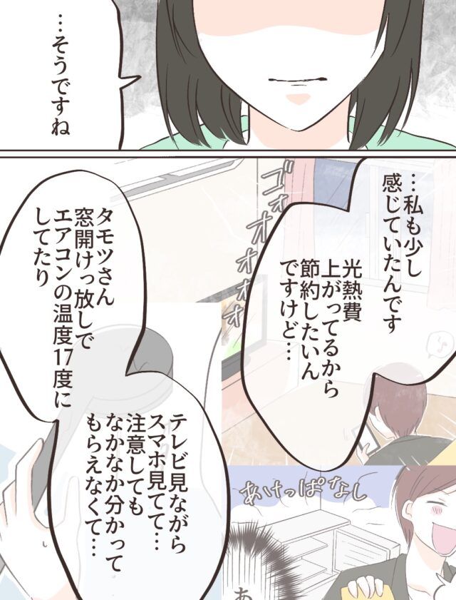 「息子に借金の肩代わりをさせたくないの。・・わかってくれるかしら?」タモツさんのお母さんにそう言われたまひろさんは、「・・そうですね」と答えた後で、「・・私も少し感じていたんです。光熱費上がってるから節約したいんですけど・・タモツさん、窓開けっ放しでエアコンの温度17度にしてたり、テレビ見ながらスマホ見てて・・注意してもなかなかわかってもらえなくて・・」タモツさんに対して普段感じていたことを話しました。
