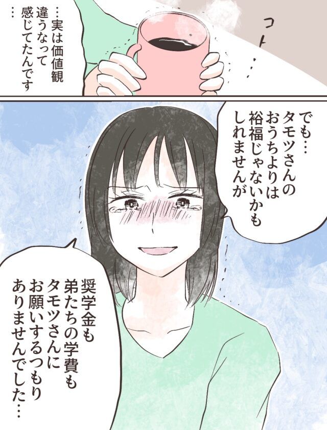 そして「・・実は、価値観違うなって感じてたんです・・。でも・・タモツさんのおうちよりは裕福じゃないかもしれませんが、奨学金も弟たちの学費も、タモツさんにお願いするつもりありませんでした・・」目に涙をためながら、まひろさんはお母さんに言いました。