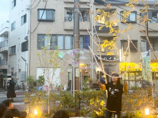 しゃぼん玉師さんが作った大きなしゃぼん玉に子どもたちは夢中
