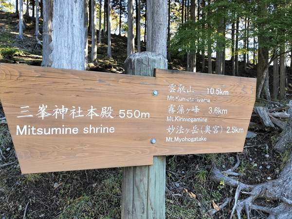 左の三峯神社本殿と食べ物屋さんとは逆の左方向”妙法ヶ岳(奥宮)へ進みます。2.5kmと記載されています。