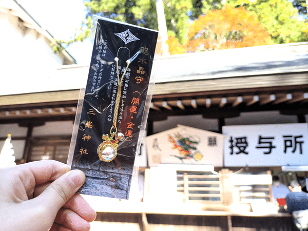 娘の希望で、『龍水晶守』を購入しました。金と銀があって、金をチョイス。突如として浮き出た”龍”にあやかり奉製されたと記載されています。開運・金運にめぐまれますように!