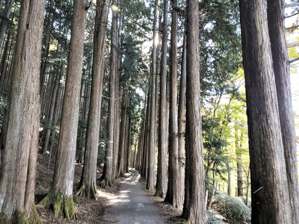 大きくて力強い木々や石灯籠が連なり、神秘的な空間に包まれます。