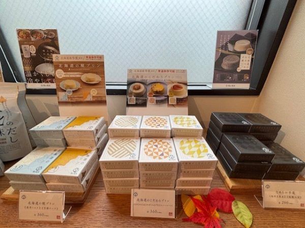 北海道の糀プリン(濃厚ミルク、芳醇チーズ)、北海道のこだわりプリン(なめらか大豆、かぼちゃあずき、スイートコーン)は各360円。北海道のなめらか羊羹(塩麹大豆、粗砕き黒豆)は290円。他にもこだわりたくさんの糀干しいも、クッキーや大福などもありました♪