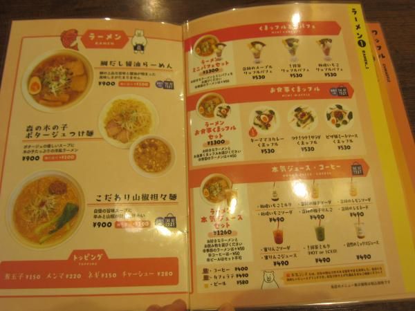 何を食べようかな~?せっかくだから、ラーメン・ワッフル・ジュース、全部食べたいな~。ラーメンお食事くまッフルセットと、ラーメン本気ジュースセットと、本気ジュースの単品にしました。