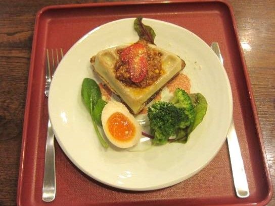 サクっと、フワっとした食感のワッフルは、国産小麦とたっぷりのアーモンドを使用していて、香ばしくて美味しいです。ミートソースやお野菜やたまごと一緒に食べると更に美味しいですよ。