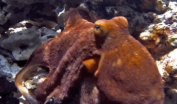 それから昼間に活動するタコは身を隠す方法として、カモフラージュよりも岩場の隙間や穴に隠れることを多用しています。