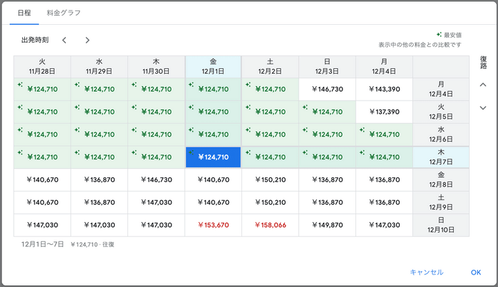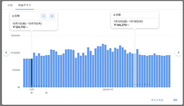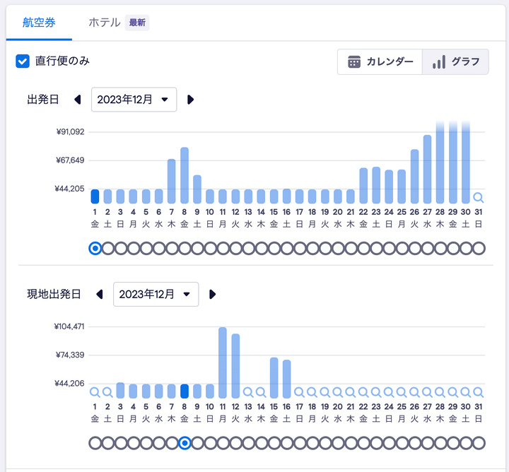 料金グラフ機能では、第一希望と他の日程との料金の比較をグラフと数字で表示してくれます。12月のいつが安いか…を月全体で一気に見ることができるので、最安日がすぐ分かります。