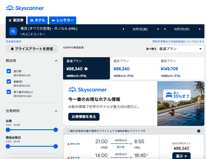 >PC版「スカイスキャナー」(航空券比較サイト)を使いこなすことが重要!