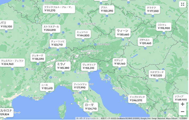 地図を拡大していくと、知らない名前のニッチな空港もたくさん。同じイタリアでもローマ行きが一番安いな、など場所で比較できるのも面白いです。