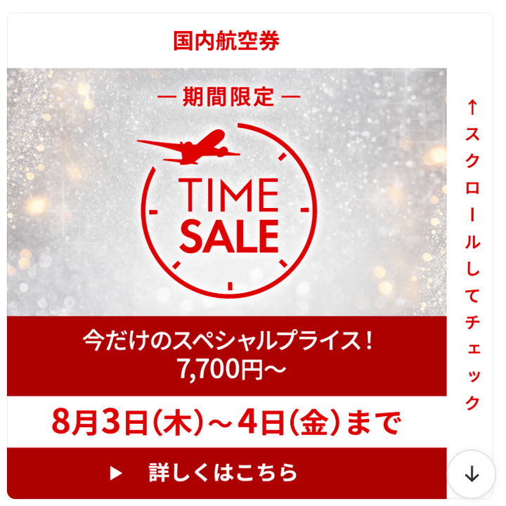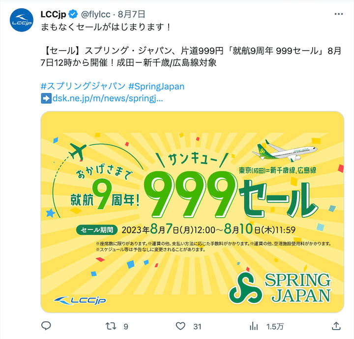 セールをやってる表示を見て検索したけど、あまり安い航空券が無い…。そんな経験ありませんか?実は航空会社のセールは、セール開始時間をチェックし、オンタイムでアクセスするのが重要。安くてお得な航空券は、セールが開始してすぐ売れ切れてしまいます!LCCjpは、航空券のお得なセール情報などをリアルタイムで発信してくれる便利なアカウント。フォローしておいて、気になる路線のセールが発表されたらすぐにチェックして!特にLCCなどの格安航空会社で発表するセールは、片道999円〜など驚きの価格で出ていることが多くあります。その価格で購入するなら、セール開始と同時にアクセスが鉄則です。