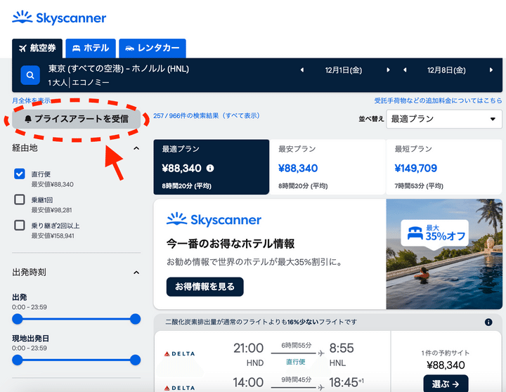 PC版では、「プライスアラート」ボタンも分かりやすい場所にあるので、すぐ設定できます。「プライスアラート」とは、航空券の値動きを知らせてくれるメール通知。ホノルル行きの航空券を最安でGetしたい時は、プライスアラートで値動きをチェックして最安を買いましょう!
