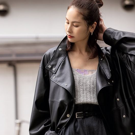 3. ハードなフェイクレザーはシアーやニットをチラ見せがポイント!【重ね着のプロに聞くテクニック】