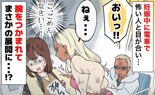 「目合った…」妊婦健診に行く電車で怖い人に絡まれピンチの私。腕を掴まれて恐怖!まさかの展開に!?
