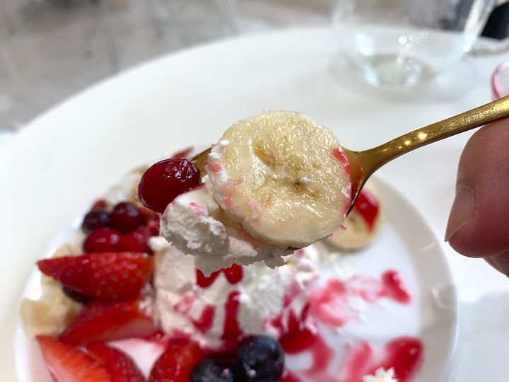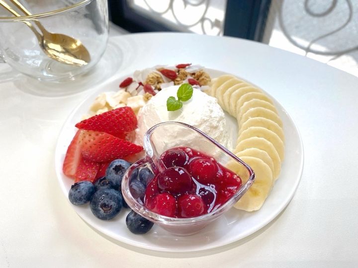 「ミックスベリー&バナナ」1750円は、3つある人気No.1メニューのうちのひとつ。ヨーグルトにバナナとミックスベリー(イチゴ、ブルーベリー、ゴジベリー)などをぜいたくにトッピングした1皿です。ベースのヨーグルトは濃厚ながら酸味が少ないさっぱりとした味わい。牛乳のミルキー感もしつこくなく、最後までペロリと食べられます。