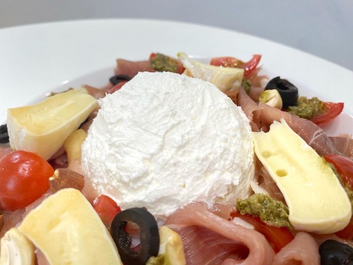 ひと口食べると、チーズとオリーブの豊かな香りが口いっぱいに広がってたまりません。生ハムは塩気はもちろん、ほどよい厚みがあるので食感も楽しめるのがポイント。全体にジェノベーゼソースがかかっていて、バジルの風味も感じられます。