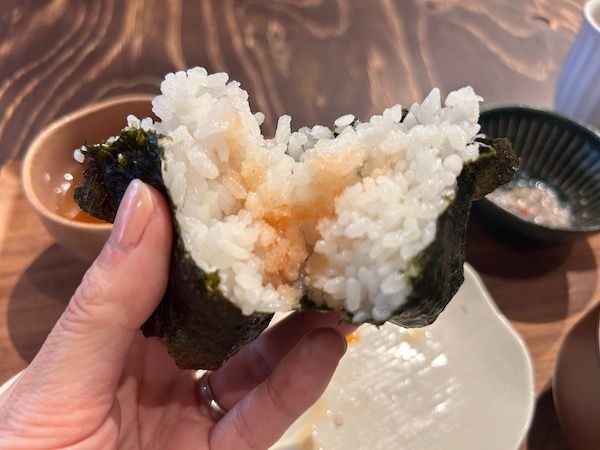 1口目。ほろほろと溢れるようにいくらがお口に流れ込んできます。美味しい!後からご紹介しますが、こちらの大将は和食専門でお魚に精通している方です。おむすびを堪能するには美味しい具も大切。最初の一口目のインパクト、すごいです!