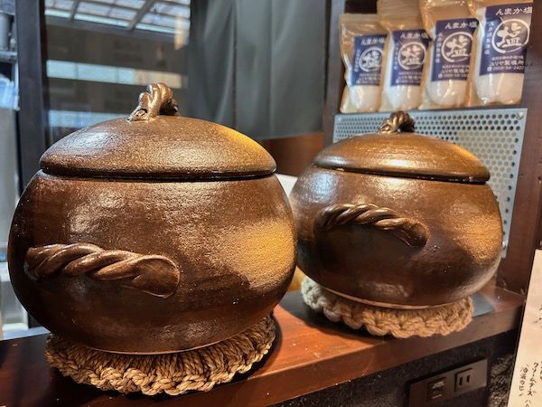 実はこのお米はこちらの土鍋で丁寧に炊き上げられています。何か昔話に出てきそうな可愛らしいフォルムじゃないですか? 7合まで炊ける土鍋ですが、炊くのは1回5合までだそうです。だからお米の粒が立っていて美味しいおにぎりになるんですね!