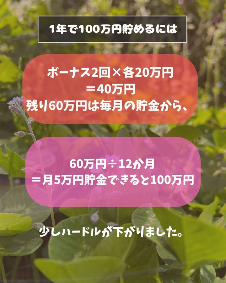 例えば、ボーナス時が2回それぞれ20万円の場合は、月5万円ずつ貯金できると100万円達成できます。月5万円も多い場合はボーナス時の金額をもっと増やせると月々の金額が少なくても達成しやすいです。