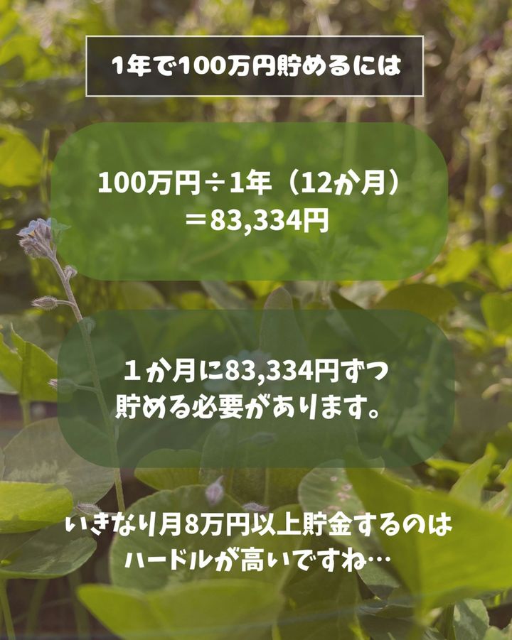 100万円を12か月で貯めるには、1か月83,334円ずつ貯金すると1年後には100万円が貯まる計算になります。