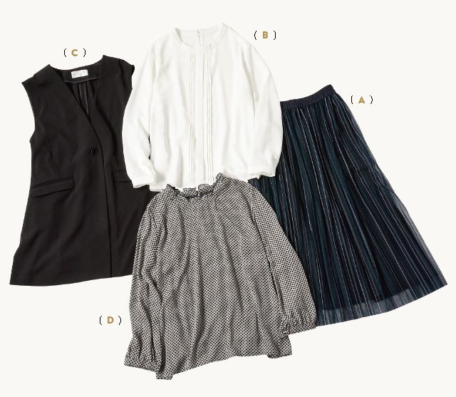 A:軽く柔らかなストライプ柄のチュールと落ち感のある上品なジョーゼット生地の2WAY仕様。リバーシブルチュールプリーツスカート L〜5L ¥8,800、B:フロントにタックを入れた甘過ぎない大人フェミニンなデザイン。ピンタックボトルネックブラウス L〜5L ¥7,700、C:深めのVネックでスッキリとハンサムな印象に。羽織るだけでこなれ感アップ! ノーカラージレ L〜5L ¥11,000、D:レトロな幾何柄もシックな色合い&上品な透け感のある柔らかな素材で大人っぽく。幾何柄フリルネックブラウス L〜5L ¥8,800/すべてfleur by mint breeze(ヒロタ)