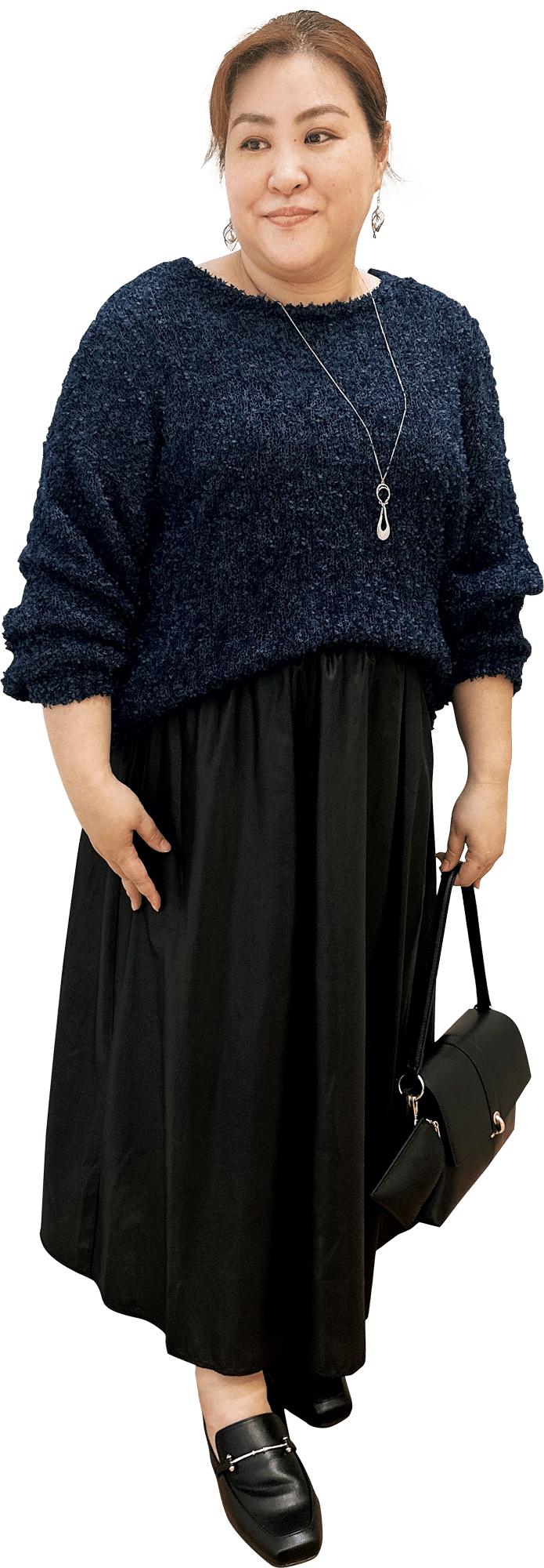 テープヤーンニット 1、2 ¥8,990、レザー見えスカート 13、15号 ¥12,990、ネックレス ¥3,490、バッグ ¥8,990、シューズ L、LL ¥7,990/すべてエウルキューブ その他/本人私物