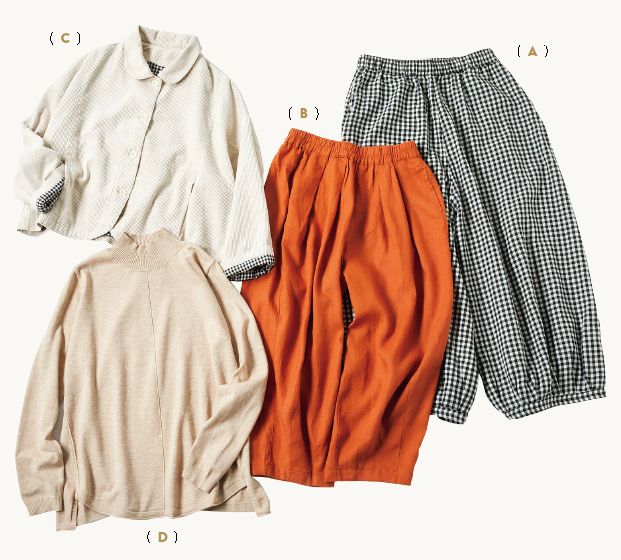 A:ふんわり軽く、柔らかな肌あたり。ワイドシルエットで羽織としても活躍。ワイドシャツブラウス M-L〜3L ¥4,950、B:秋らしいカラーリングのチェック柄。体のラインを拾わないシルエットで心地よく。コットンチェックタック袖ブラウス M〜3L ¥5,390、C:上質なフレンチリネンを使用。ヴィンテージな風合いで着るごとに味わいを増す一着。前後2WAYジャンスカワンピース M〜3L ¥8,910、D:柔らかく優しい肌触りの綿麻素材。お花モチーフの幅広コットンレースで足元を軽やかに演出。レースペチパンツ M-L〜LL-3L ¥2,970/すべてecoloco(エコロコ)
