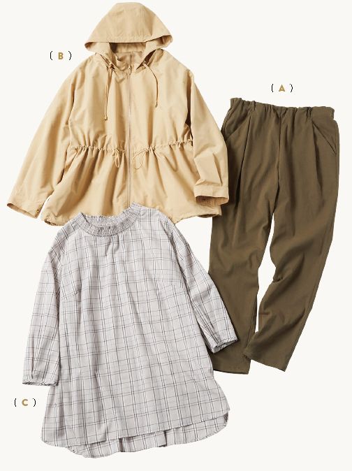 A:大人気のストレッチパンツは、ウエスト総ゴム仕様でストレスフリーなはき心地。ストレッチテーパードパンツ 13〜17号 ¥8,990、B:ウエストと裾はゴムスピンドル入りで気分や着こなしに合わせてシルエットを自由にアレンジ。マウンテンパーカー 13〜17号 ¥16,990、C:襟ぐりのさり気ないシャーリング×落ち着いた配色のキレイめなチェック柄で大人かわいいデザインに。シャーリングチェックブラウス 0〜2 ¥9,900/すべてエウルキューブ