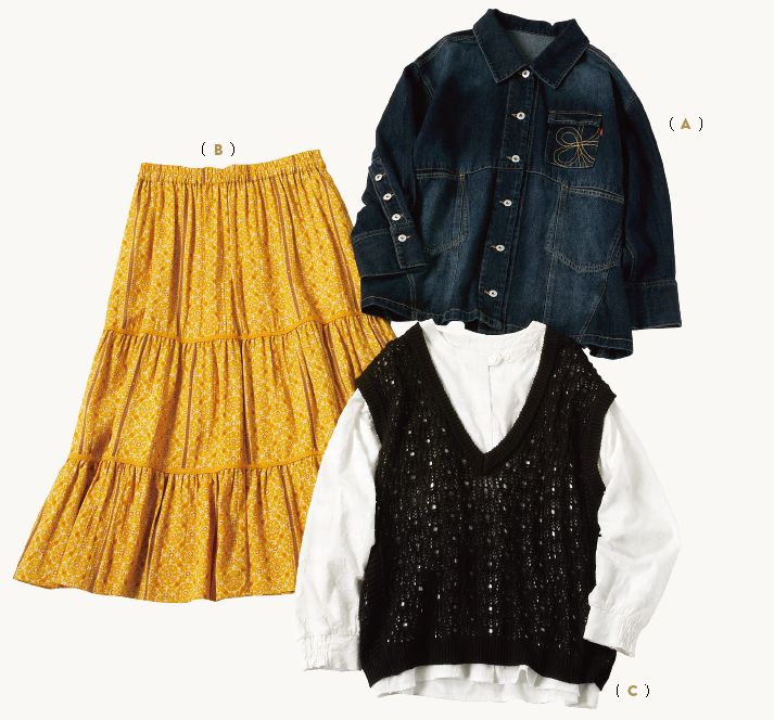 A:程よいビッグシルエットでこなれ感たっぷり。変形ポケットや袖口いっぱいのボタンなどデザインポイント満載。ジージャン 3(15-17号相当)、5(19-21号相当) ¥21,780、B:インドならではの柔らかなコットン素材に花柄&繊細なデザインで華やかさ満点。ティアードスカート 3(15-17号相当) ¥18,480、C:ゆったりとしたニットベスト&控えめな花柄のジャカードシャツ。単品でも使えて着回し力抜群。ベスト&シャツセット 3(15-17号相当)、5(19-21号相当) ¥20,790/すべてアズ ノゥ アズ オオラカ(アズ ノゥ アズ)