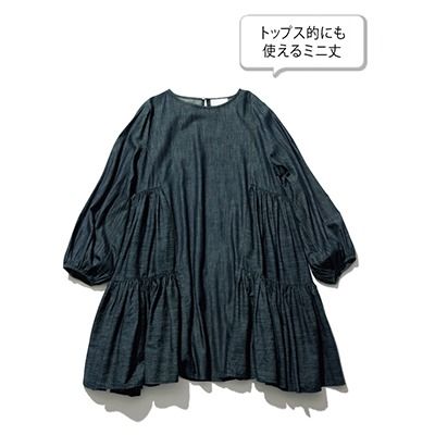 丸みのあるそでと、両サイドだけギャザーを寄せてティアード仕様になったひかえめなすそ広がり。しなやかな薄手の生地だから、ニットカーデやコートを重ねてももたつく心配はなし。ひざ上丈で、ロングブーツを合わせたり、ボトムレイヤードも楽しめる。