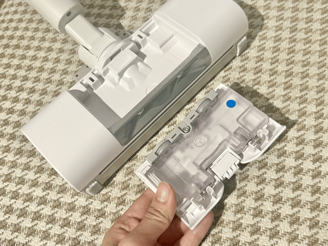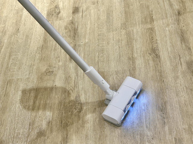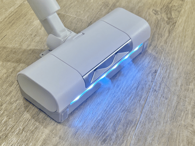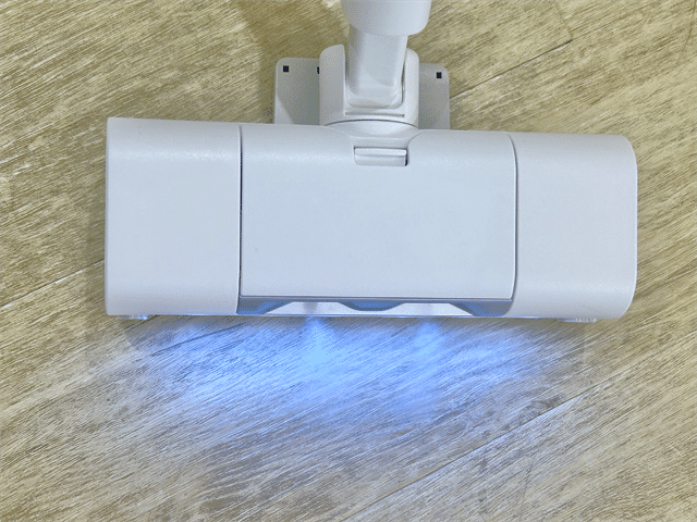 床用ノズルのブラシが回転すると同時にLEDライトがついて、見えやすい! 家具の下など暗いところの見えにくいゴミも見やすく、取り残しを防ぐことができそうです。