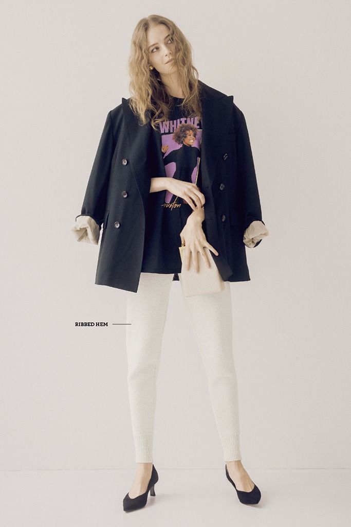 肉感を拾わない地厚な白。迫力のあるフォトTとオーバーサイズのジャケットで、気になる腰まわりもカバー。すそから幅広めに設定されたリブの切り替えが足首を細く見せてくれる。パンプスは黒を選んで、メリハリを。