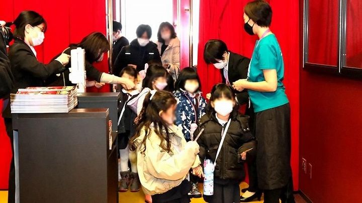 親子鑑賞では、もう会場に来たときからわくわくしてもらえるように、入口からキャストやスタッフが皆さんをお出迎えします。