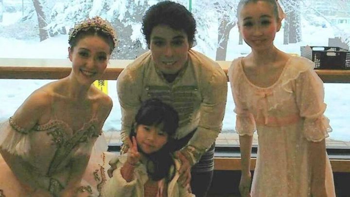 2度目に観た「くるみ割り人形」の上演後、桝谷まい子さん・清水健太さんと記念撮影をした齋藤楓さん(当時6歳)