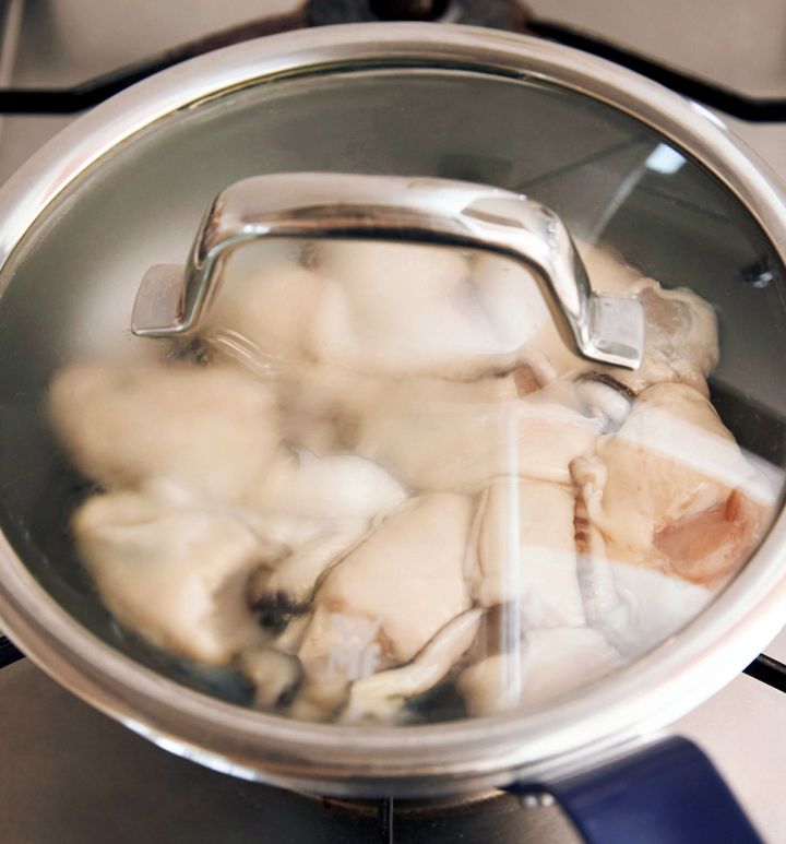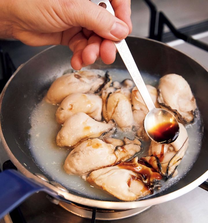 かきの下ごしらえ(上記)を参照し、水けをしっかりと拭く。直径約20cmのフライパンに並べ入れ、ふたをして中火で5分ほど蒸し焼きにする。