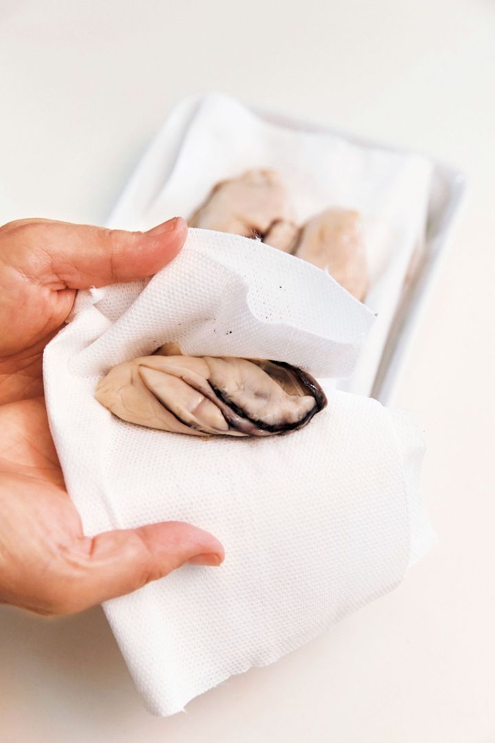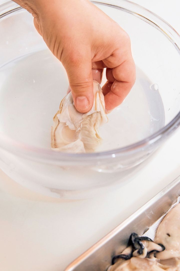 (1)ボールに塩水※(水2と1/2カップに塩大さじ1が目安)を入れる。かきを1個ずつ入れ、振り洗いをする。
